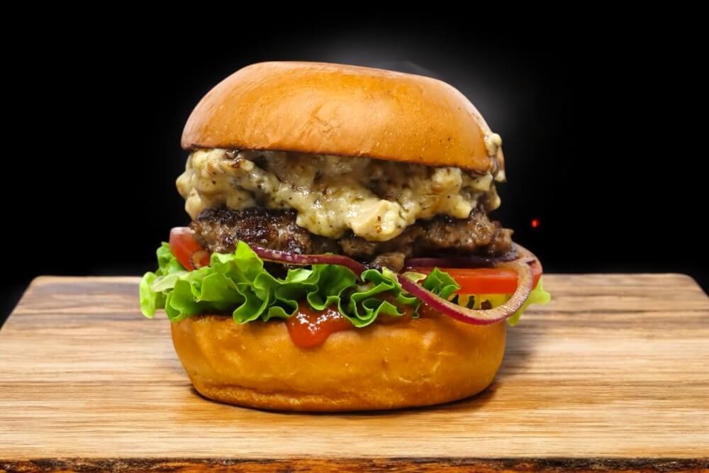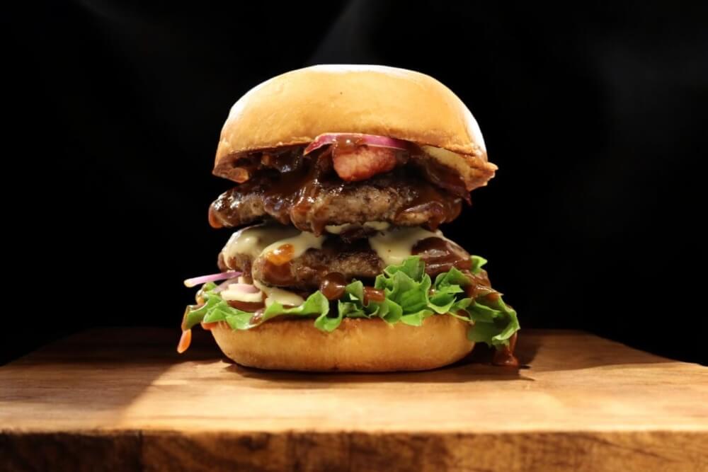 2 X 140gm Angus Beef Patty, Double Streaky Bacon, Cheese Sauce, Lettuce, Onion, BBQ Sauce, Relish Served on a Toasted Brioche Bun