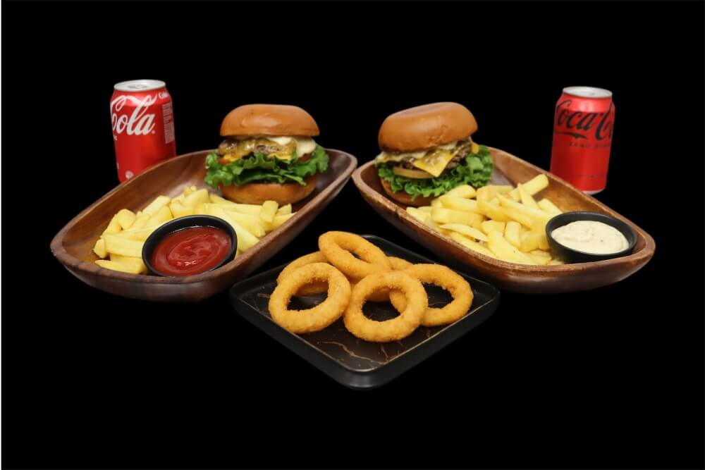 2 x Angus Cheeseburger 2 x Steak cut Fries 1 x Onion Rings 2 x 330ml fizzy drink