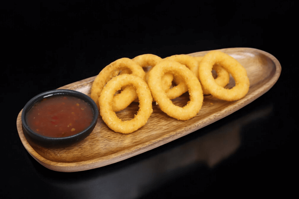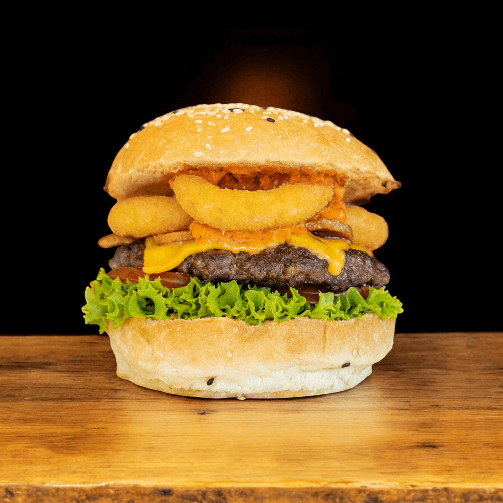 Angus Beef, Streaky Bacon, Cheddar Cheese, Crumbed Onion Rings, Lettuce, Red Onion, Chipotle -Mayo Served on a Toasted Brioche Bun