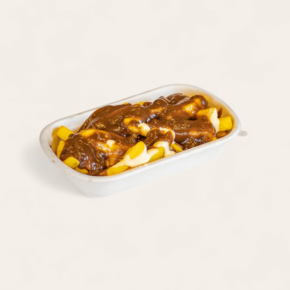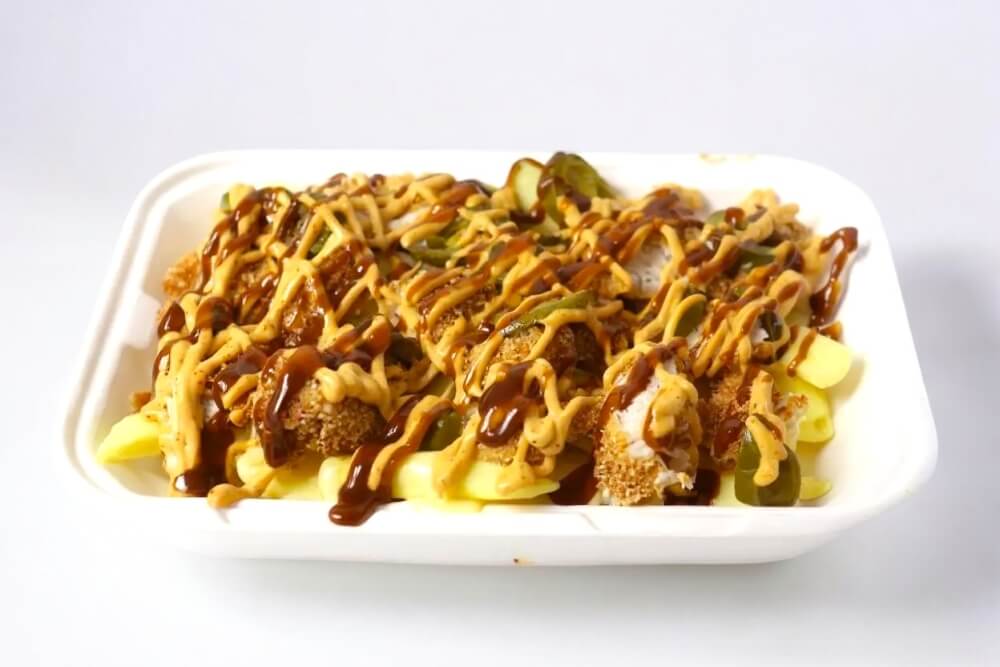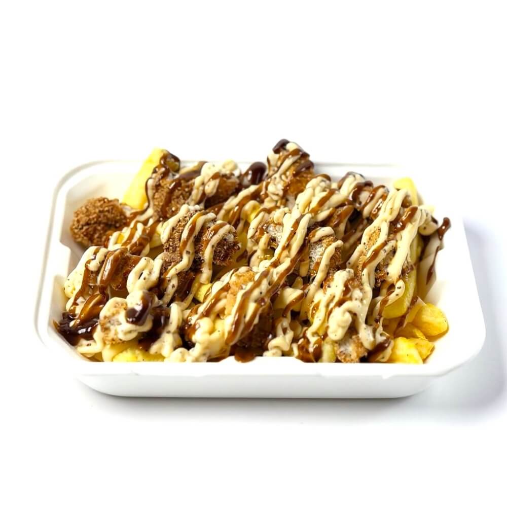 Crispy Chicken, Cheese Sauce, BBQ sauce & Aioli over Golden Fries