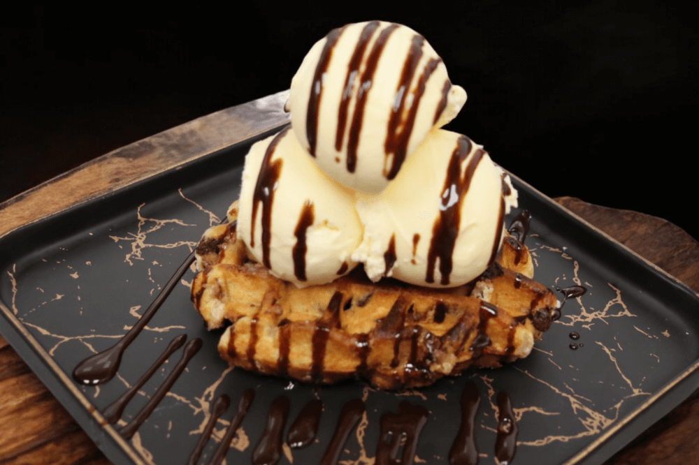 Toasted Choc-chip Waffle with French Vanilla Ice-cream topped with Hershey's Chocolate Sauce