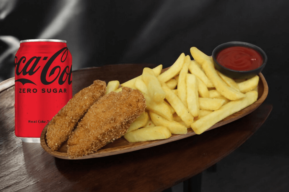 2pcs Crumbed Chicken Tenders with steak cut fries and a 330ml drink